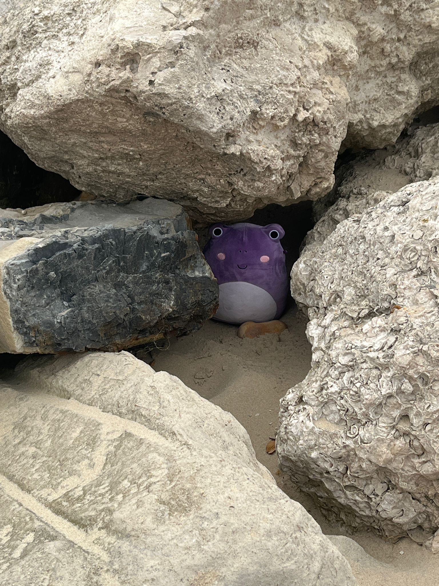 Arriving on the rather stony beach, Philomena decided to hide herself from the predator Lucy by taking shelter in some nearby rocks while her owner and summer guardian swam in the seaweedy sea. Philomena was thrown and caught, and ignored brutally by Lucy who made her become sandy, a very unpleasant experience as she was thrown in a bag and marched down the hill.